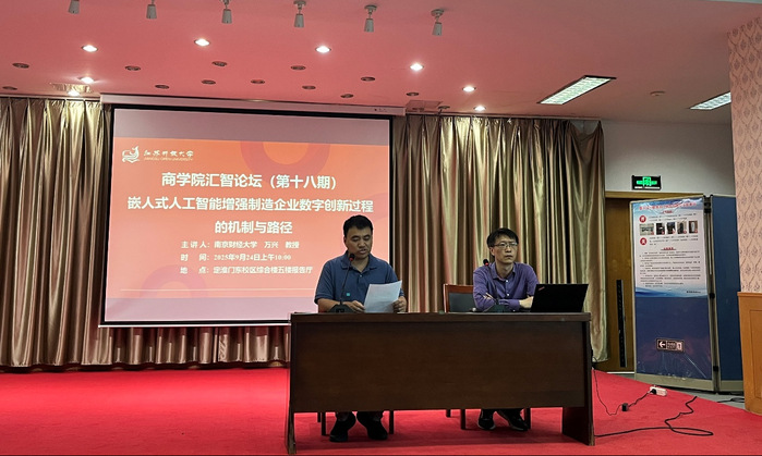 9月24日上午,商学院于综合楼五楼报告厅成功举办汇智论坛(第十八期),本期论坛聚焦于“嵌入式人工智能增强制造企业数字创新过程的机制与路径”,特邀南京财经大学教授万兴主讲。此次论坛由商学院副院长朱长春主持,商学院全体教师参加。论坛主题是万兴教授今年刚获批的国家社科基金项目选题。万教授围绕该选题深入分析了从互联网平台经济到嵌入式人工智能的迭代发展过程。在申报选题方面,他强调要锚定国家战略需求与产业实际痛点的结合点,避免选题过于宽泛或脱离实践,要围绕国家发展进行深入积累,要针对企业需要开展调查研究,通过论文、项目、进修等形成自己独特学术价值;在申报经验上,他从申报书撰写规范、研究团队组建、前期成果积累等实用维度,结合自身多年申报与评审经验,梳理了材料准备中的关键注意事项;在课题论证环节,他重点讲解了研究方案设计、技术路线规划、预期成果设定的逻辑框架,强调论证需紧密围绕选题核心,通过数据支撑与案例佐证增强说服力。此外,万兴教授指出,人工智能在科研过程中,可高效处理多源异构数据、加速文献分析与选题定位,辅助构建研究模型,青年教师应突破传统研究方法局限,充分利用人工智能为科研选题、论证、实证及成果