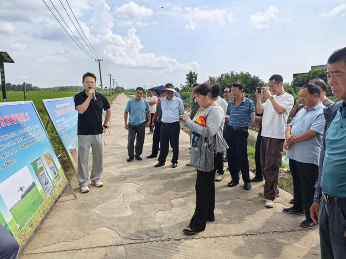 8月26日,由我校乡村振兴学院与六合区农业农村局共同承办的六合区整建制开展稻麦(油)轮作大面积单产提升项目片区建设水稻后期田管现场观摩暨秋播技术培训会在六合区竹镇镇召开。江苏开放大学专家技术团队、六合区农业农村局分管负责人及相关科站农业技术人员、六合区街镇农村部门负责人、种植主体代表等约120人参加现场观摩与培训。培训伊始,全体参训人员来到立友农机服务专业合作社水稻种植基地进行现场观摩。此时水稻正处于抽穗扬花期,是水稻产量形成的关键时期,连片的水稻长势喜人,穗大粒多,一片丰收在望的景象。在观摩现场,江苏开放大学专家技术团队丁超博士,重点围绕如何落实水稻高温热害应对措施,以及中后期水肥管理,进行了深入浅出的现场讲解。这种“田间课堂”的形式,直观生动,针对性强,让种植主体受益匪浅,对如何抓好下一步水稻中后期田管有了更清晰的认识和把握。随后,全体人员在光华村会议室参加了集中培训。江苏开放大学专家团队特聘专家、推广研究员管永祥教授首先作专题辅导。他系统复盘了我区水稻前期的田间管理、剖析了当前存在的问题,并重点讲解了后期田管关键技术措施。他强调,面对持续高温天气,种植主体要主动出击,采取“以水调